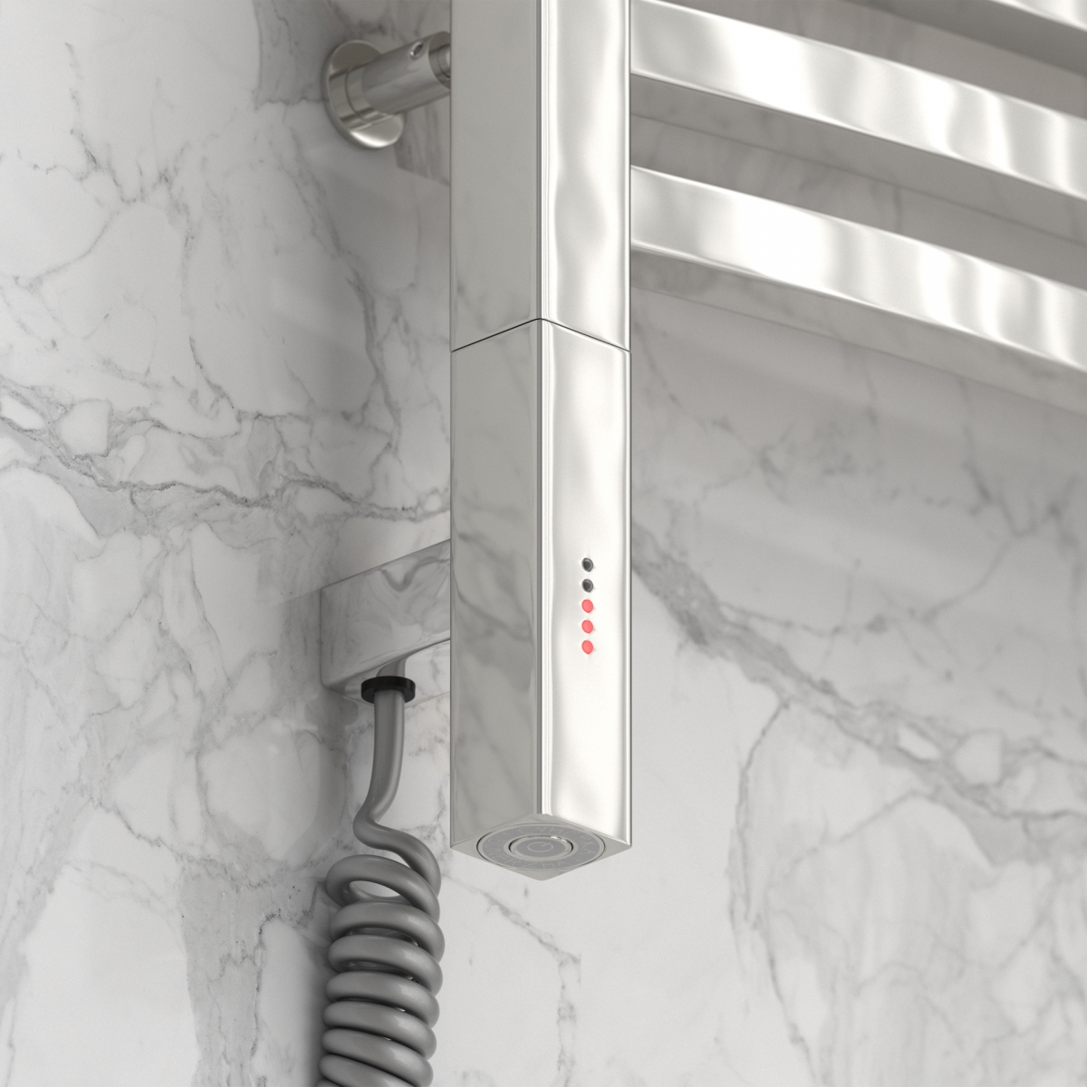 Блок управления МЭМ Сунержа® выполнен в едином стиле с полотенцесушителем и визуально является продолжением коллектора. В зависимости от выбранной модификации МЭМ может быть расположен справа или слева. В стандартной комплектации – кабель длиной 1,5 м и модуль для скрытого подключения полотенцесушителя.